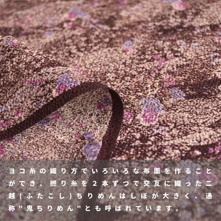 ヨコ糸の織り方でいろいろな布面を作ることができ、撚り糸を2本ずつで交互に織った二越(ふたこし)ちりめんはしぼが大きく、通称"鬼ちりめん"とも呼ばれています。