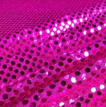ラメ糸を絡ませた薄手のニット生地の上に、約6mm大のスパンコールを貼り付けています。
