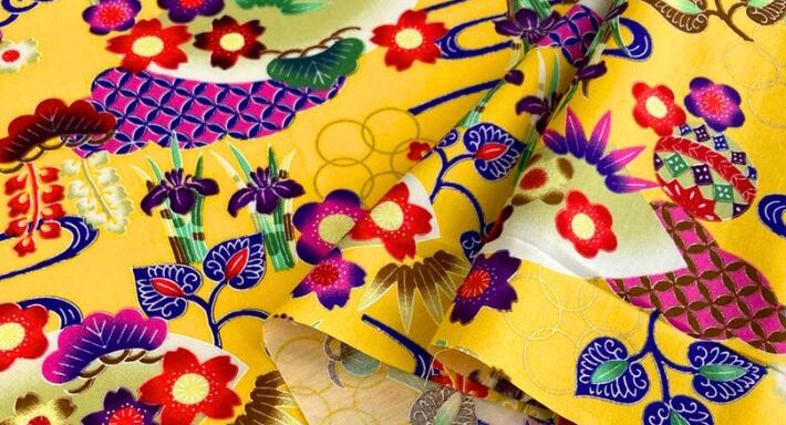 【3.山吹】地色は赤みの黄色。柄色は赤・紺・緑・紫・唐紅・茜色・こげ茶色・鶯色・芥子色