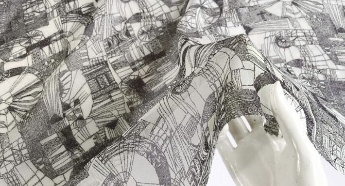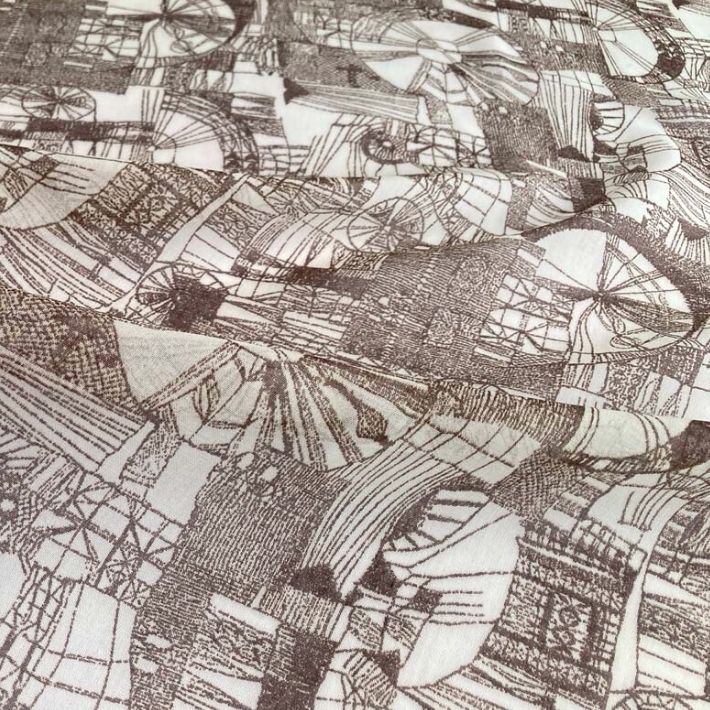 直線や円・多角形を複雑に組み合わせた幾何学柄。規則性は少なく、抽象柄に近い印象です。フリーハンドの偶然性を活かした緻密で有機的な表現。
